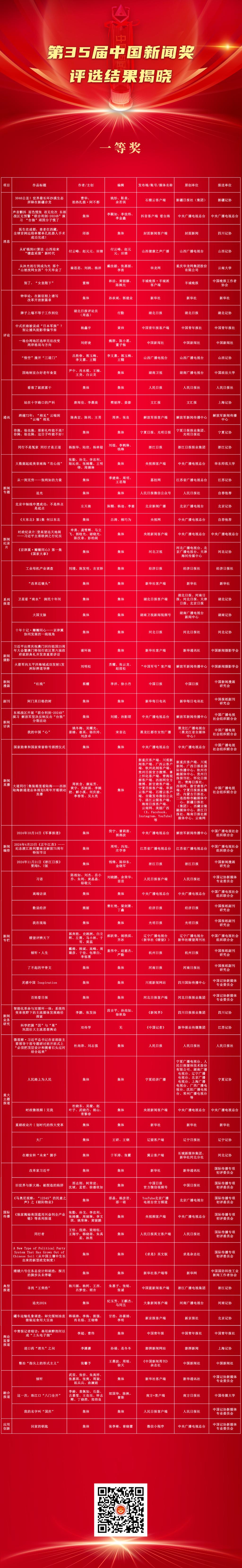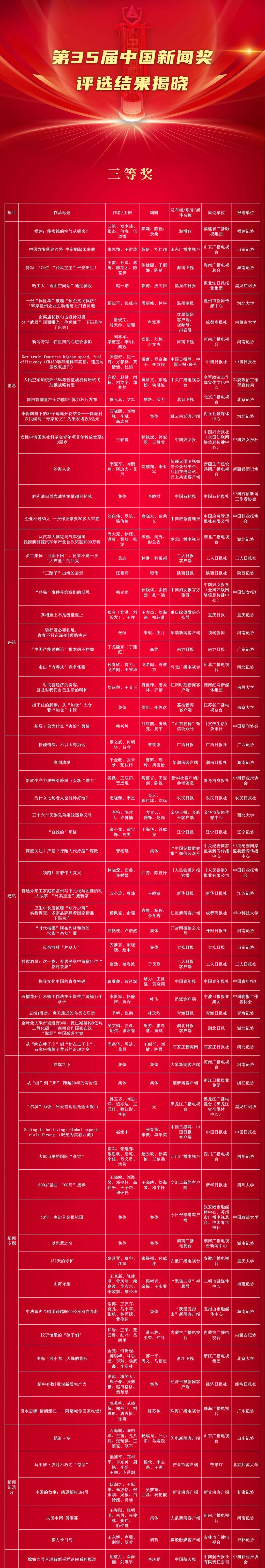 由中华全国新闻工作者协会主办的第35届中国新闻奖评选结果于11月5日揭晓。来自各级各类媒体的377件作品获中国新闻奖,其中,特别奖4件、一等奖74件、二等奖113件、三等奖186件。