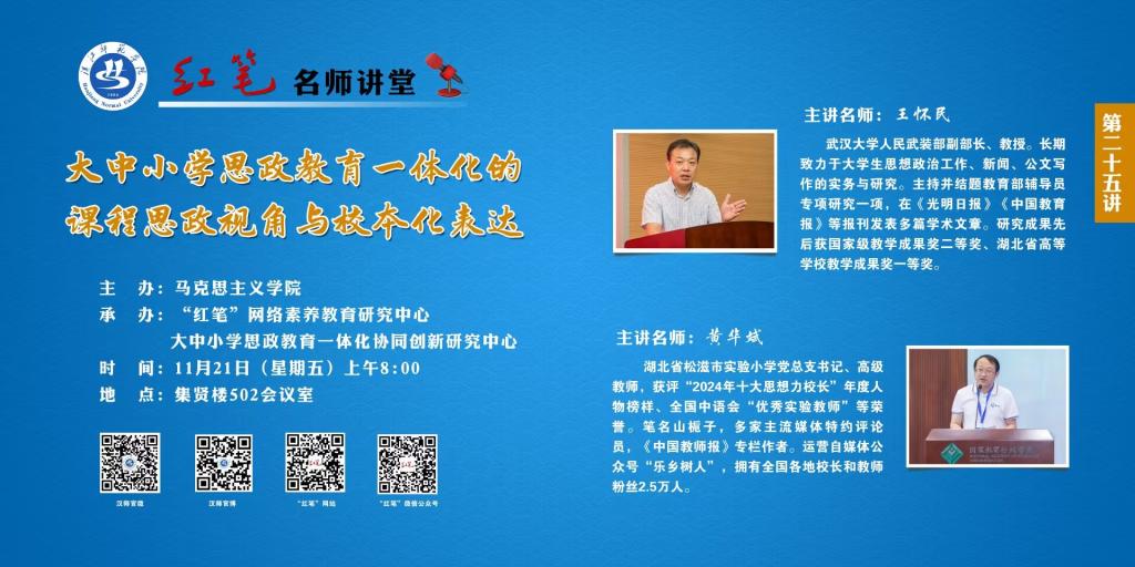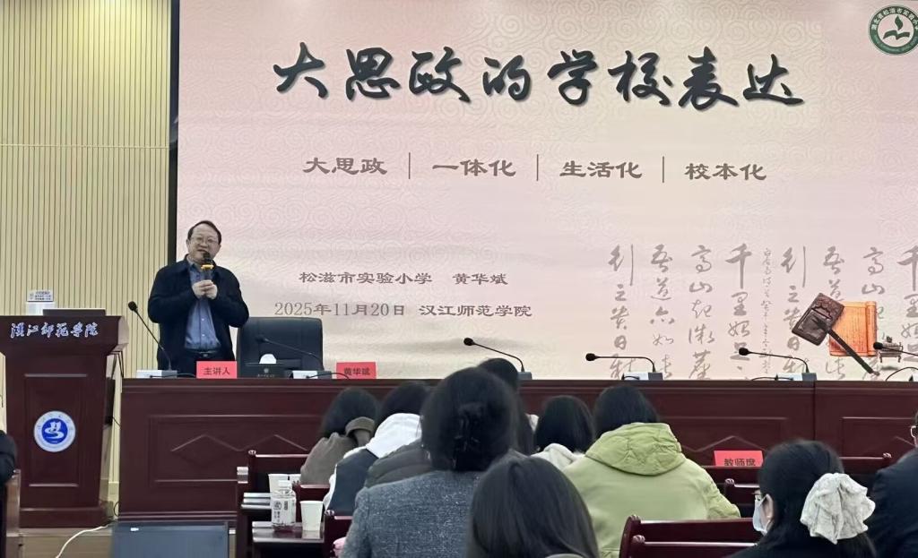11月21日,由汉江师范学院马克思主义学院主办的“大中小学思政教育一体化”专题培训在集贤楼502会议室举行。讲座邀请了武汉大学王怀民教授、湖北松滋实验小学党总支书记黄华斌联袂主讲,吸引了全市中小学思政课教研员、骨干教师、一体化示范校代表及高校师生共百余人前来聆听。
