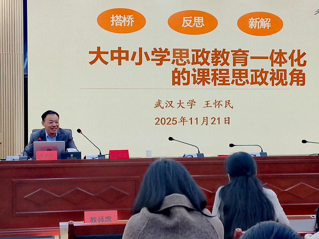 武汉大学王怀民教授作了题为《大中小学思政教育一体化的课程思政视角》的专题讲座,他集中梳理了教育部相关文件精神,从“串联古今搭建历史发展之桥,联通中外搭建交流互鉴之桥,聚合素材搭建整合聚变之桥”三个维度,结合鲜活的案例,生动阐释了课程思政的内在逻辑与实施路径。王怀民在和师生亲切的交流互动中建议教师要具备广阔的视野,善于在横向对比中引导学生反思中国在历史发展中的经验教训,进而激发学生思考“我可以做什么,我能做什么”,达到课程思政的目的。