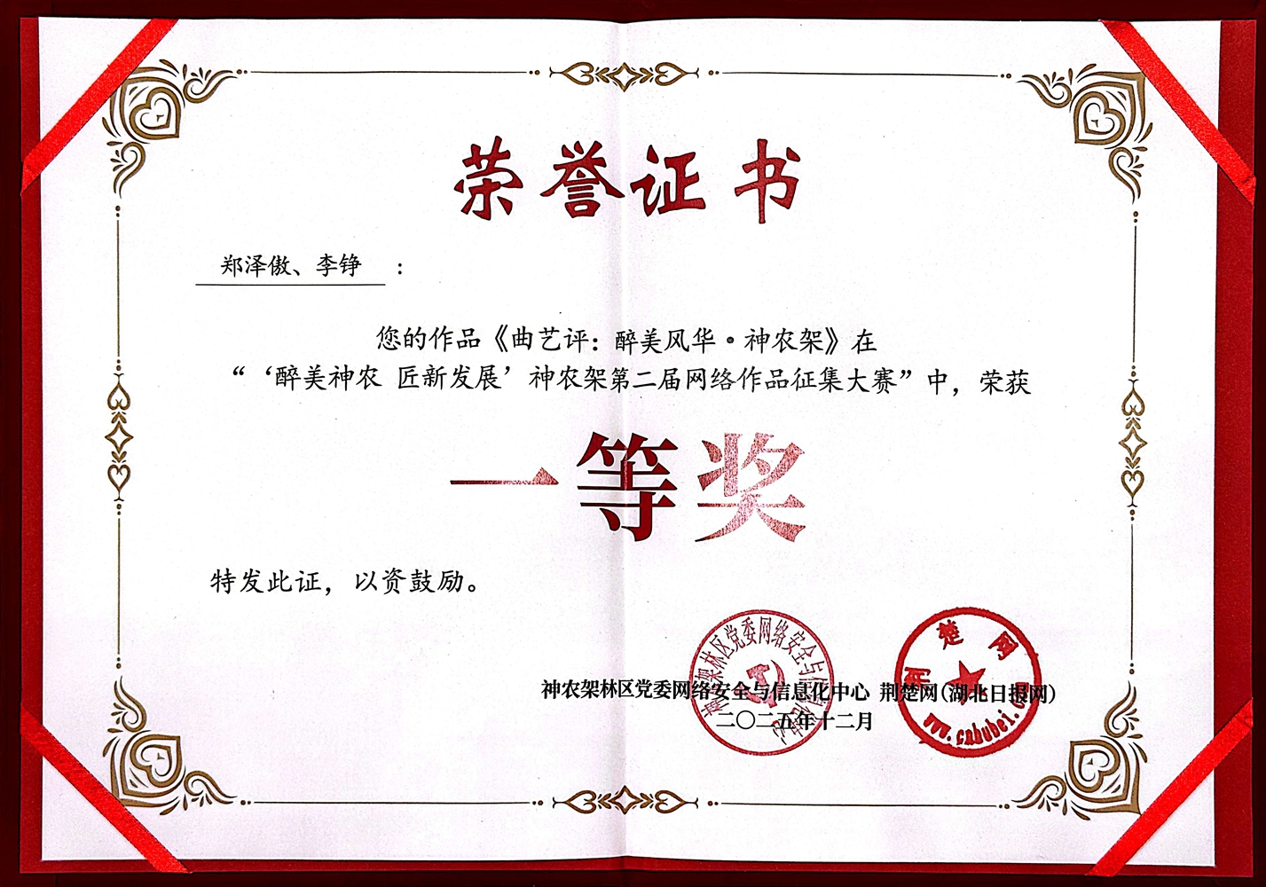 我校文学院毕业生郑泽傲凭借作品《曲艺评:醉美风华·神农架》脱颖而出,摘得大赛一等奖。郑泽傲别出心裁地将黄梅戏的婉转融进了神农架的奇山秀水,以“神农清泉酿玉液”的灵动唱词,实现了传统人文与自然生态的双向奔赴。这种跨界创新的表达形式,让神农架的形象更显立体鲜活,赢得了评委的高度认可。大家认为其作品“沾泥土、带露珠、冒热气”,成功让神农架的魅力破圈传播。