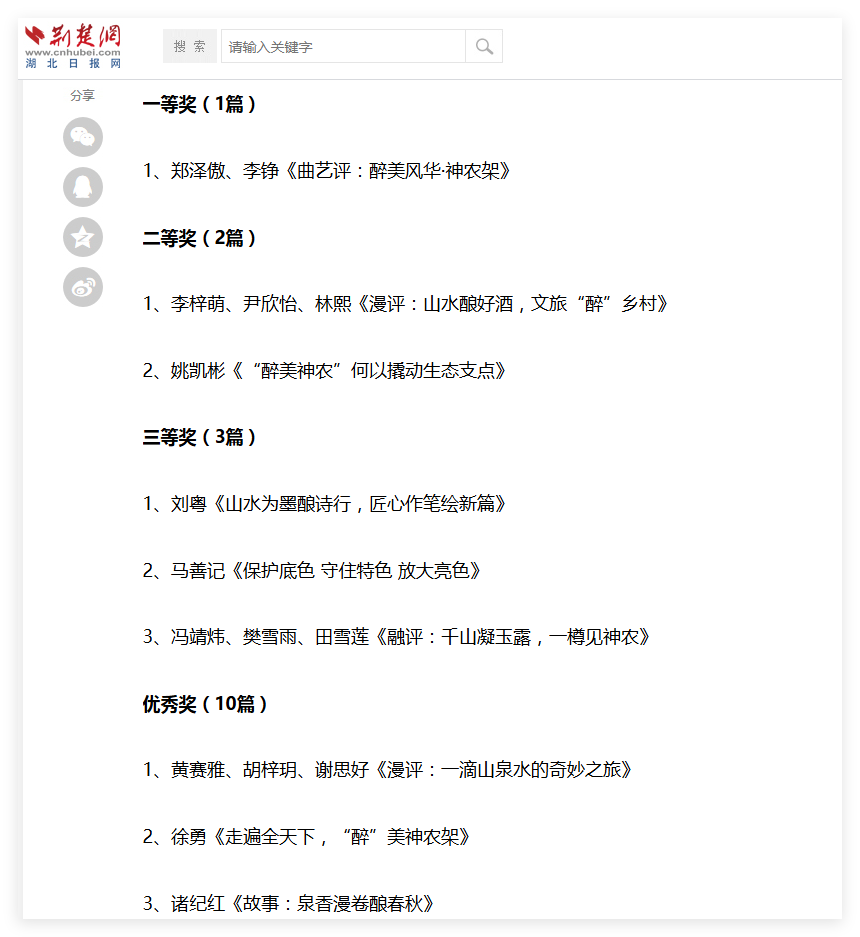 据悉,本届大赛以“醉美神农,匠‘新’发展”为主题,由劲牌神农架酒业、荆楚网(湖北日报网)联合主办,楚天网络评论研究院承办。大赛面向全国征集文字评论、创意评论、广告语等多元形式作品,共收到来自全国15个省市参赛作品1500余篇,经专家评审最终评选出17件获奖作品,其中一等奖1篇,二等奖2篇,三等奖3篇,优秀奖10篇,最佳人气奖1篇,最佳组织奖单位10家。