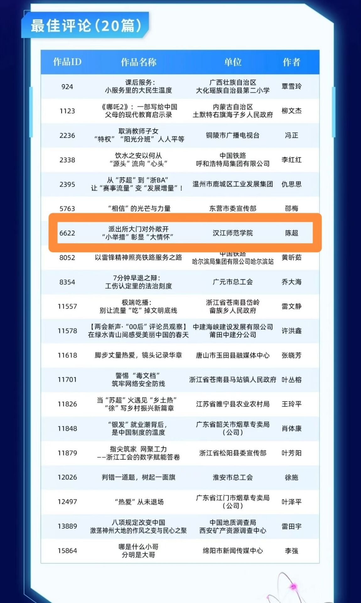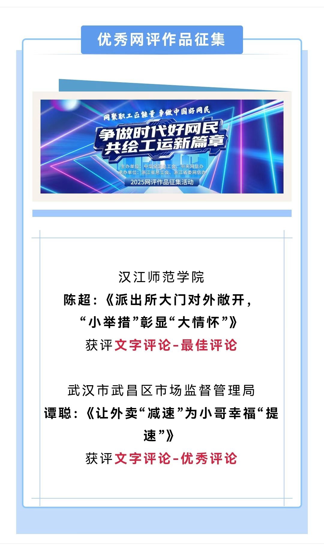 近日,由中华全国总工会、中央网信办主办的2025年“网聚职工正能量 争做中国好网民”主题活动已完成评审。经学校“红笔网”推荐,由十堰市总工会报送,我校后勤管理处(后勤服务中心)职工、“红笔”团队陈超创作的评论作品《派出所大门对外敞开,“小举措”彰显“大情怀”》获评文字评论-最佳评论。
