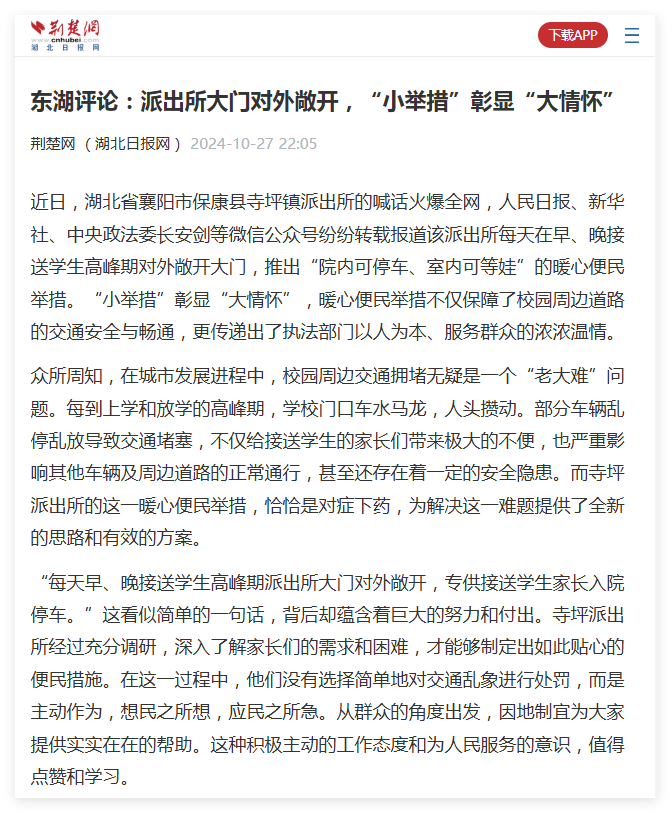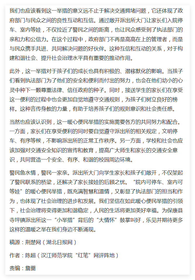 《派出所大门对外敞开,“小举措”彰显“大情怀”》一文讲述了湖北一地派出所在早、晚接送学生高峰期对外敞开大门,推出“院内可停车、室内可等娃”的暖心便民举措。文章被人民日报、新华社、中央政法委长安剑等微信公众号纷纷转载。该文在2025年“网聚职工正能量 争做中国好网民”主题活动子项目优秀网评作品征集中从1.6万件作品中脱颖而出,获评文字评论-最佳评论。