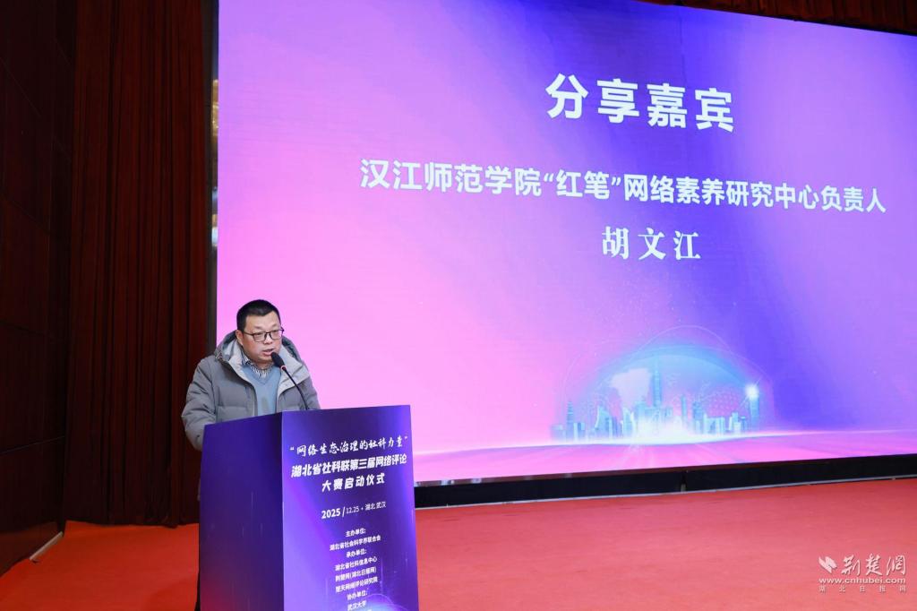 12月25日,由湖北省社会科学界联合会主办,湖北省社科信息中心、荆楚网(湖北日报网)、楚天网络评论研究院承办的“网络生态治理的社科力量”——湖北省社科联第三届网络评论大赛在武汉启动。我校“红笔”网络素养教育研究中心负责人胡文江副教授、经管学院分党委副书记张宇应邀出席。胡文江获评“文安评团队十佳网评作者”,现场分享了团队建设和网评创作经验。