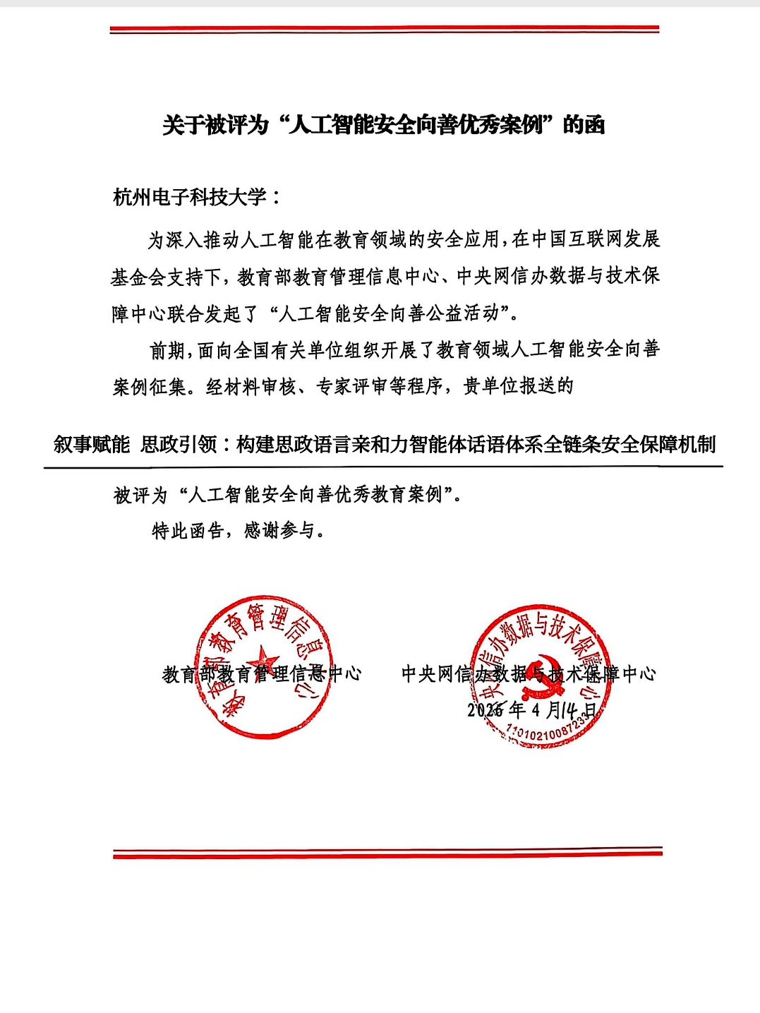 日前,杭州电子科技大学收到函告文件,经材料审核、专家评审等程序,该校报送的案例《叙事赋能 思政引领:构建思政语言亲和力智能体话语体系全链条安全保障机制》成功入选。标志着学校在人工智能赋能教育及安全治理领域的探索获得了国家级认可。