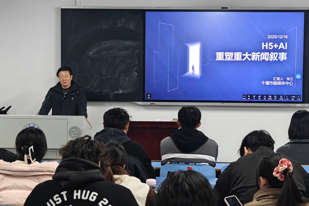 12月16日晚,十堰市融媒体中心高级记者朱江老师应邀来校,在崇文楼A510教室开展题为《H5+AI重塑重大新闻叙事》的专题讲座。讲座通过丰富案例与深度解析,系统呈现了技术赋能下新闻作品的创新形态与人文价值,为师生带来媒体融合领域的前沿思考。朱江老师在讲座中,以《我们都是收信人》《纪念“两山”理念诞生20周年》等作品为例,详解AI在新闻叙事中的应用,指出AI+H5创作的核心价值在于互动性与情感联结,通过交互操作让用户...
